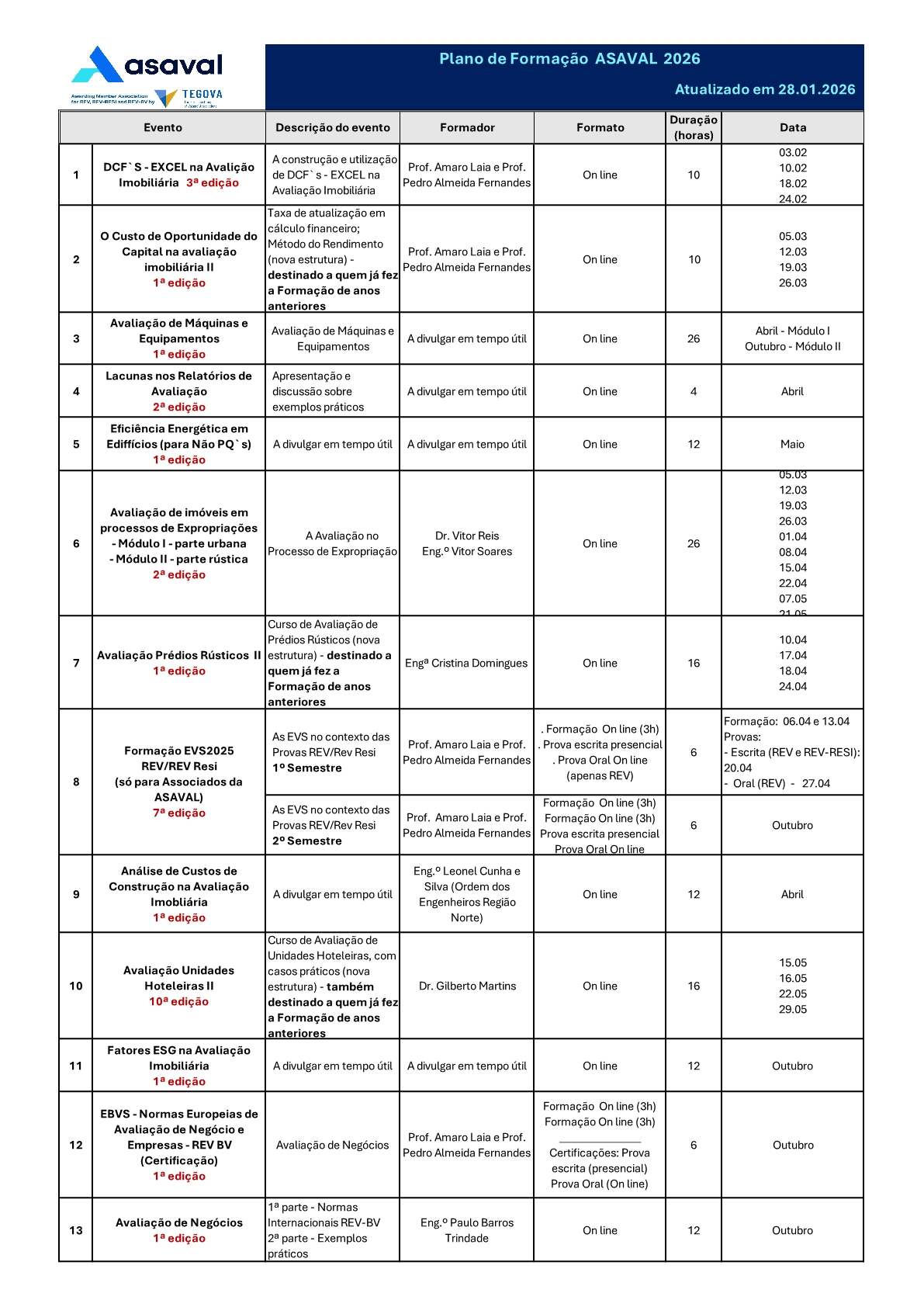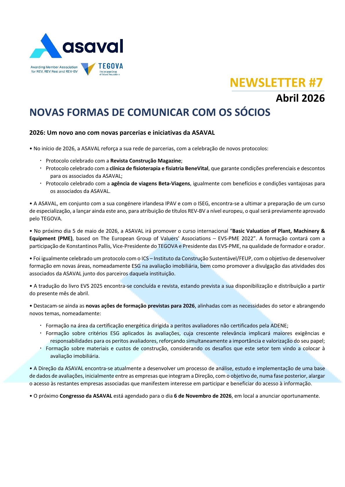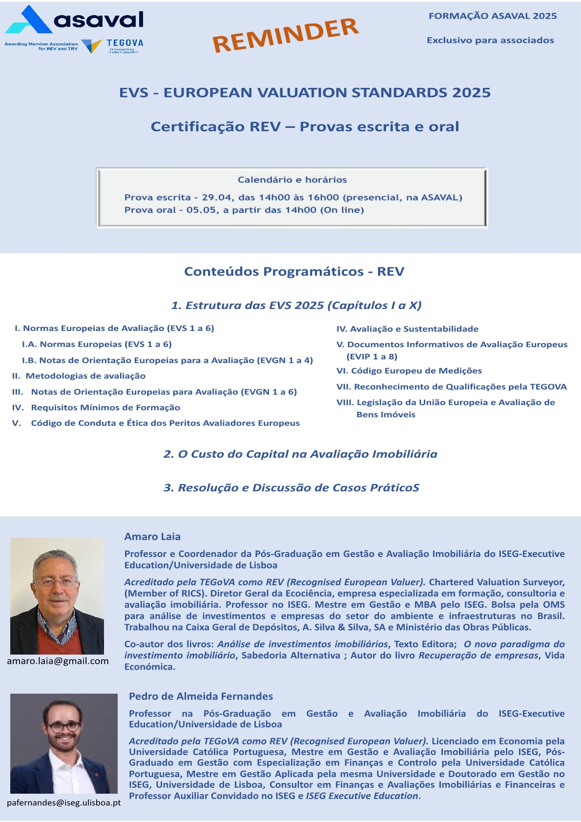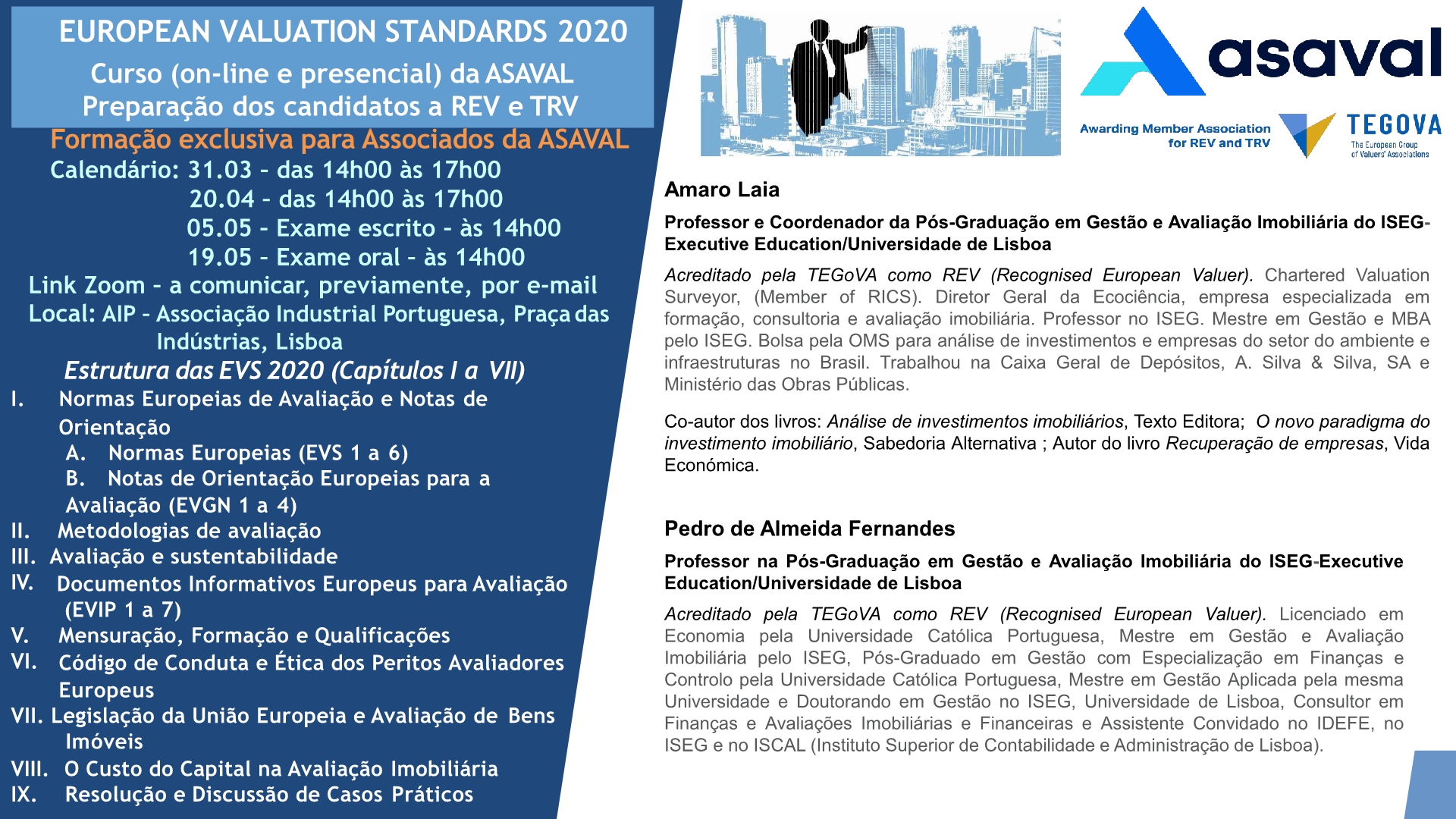 EVS 2020: Continua disponível e em exclusivo para os Associados da ASAVAL, ao preço simbólico de 25€, a versão Portuguesa das EVS 2020. Para os não Associados da ASAVAL e caso pretenda adquirir esta publicação, pelo preço de 125€, ou tornar-se nosso Associado, por favor enviar um email para:
