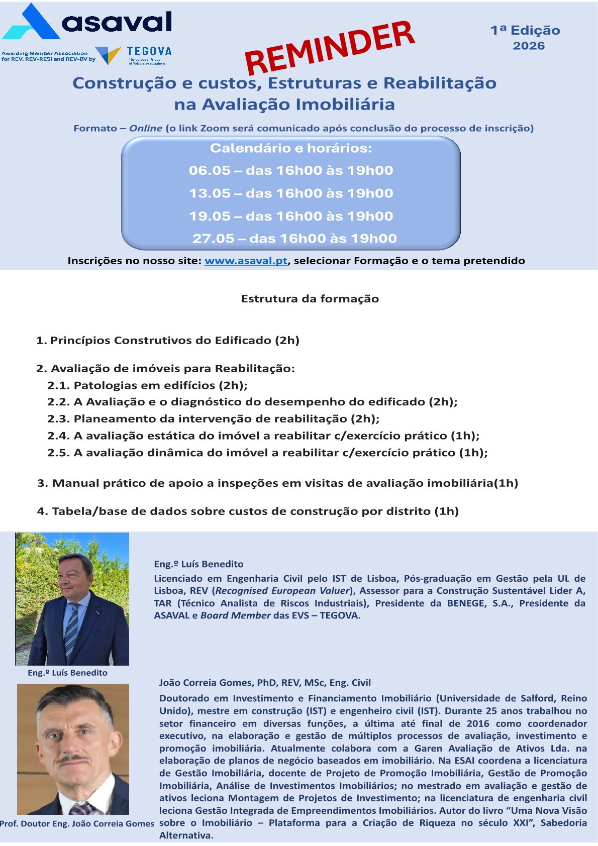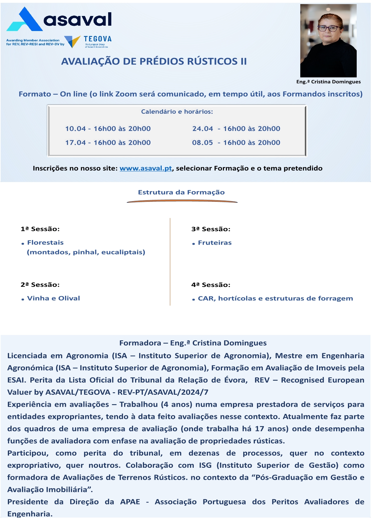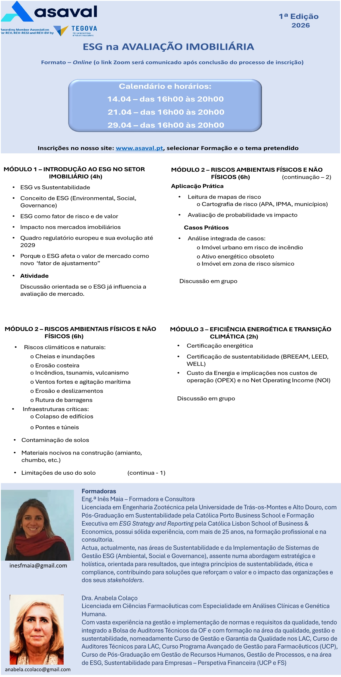 A ASAVAL valoriza a formação contínua dos peritos avaliadores, promovendo cursos periódicos sobre matérias específicas da avaliação e dispõe de protocolos internacionais, os quais permitem o acesso a um conjunto de plataformas de formação nos mais variados temas da atividade.