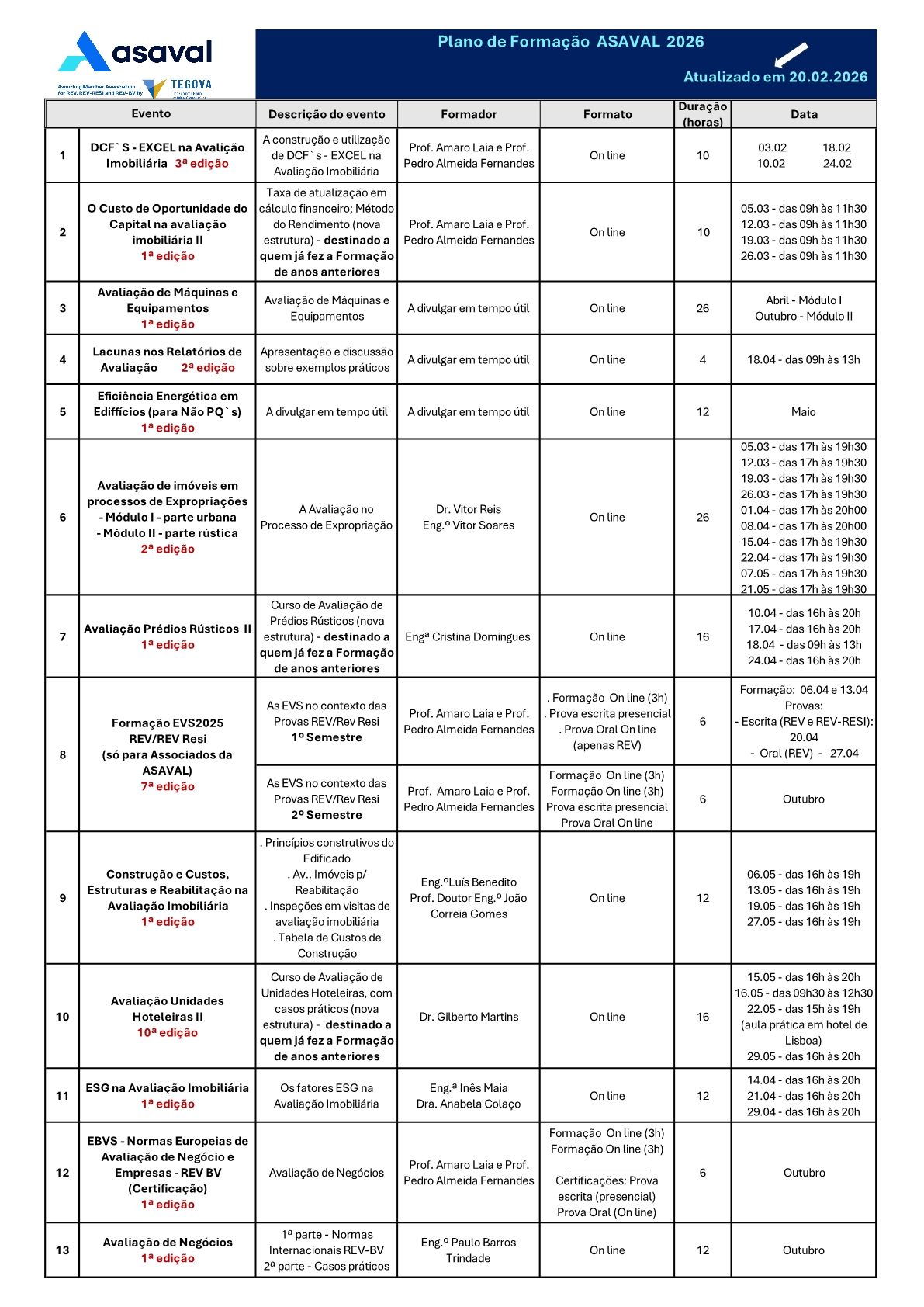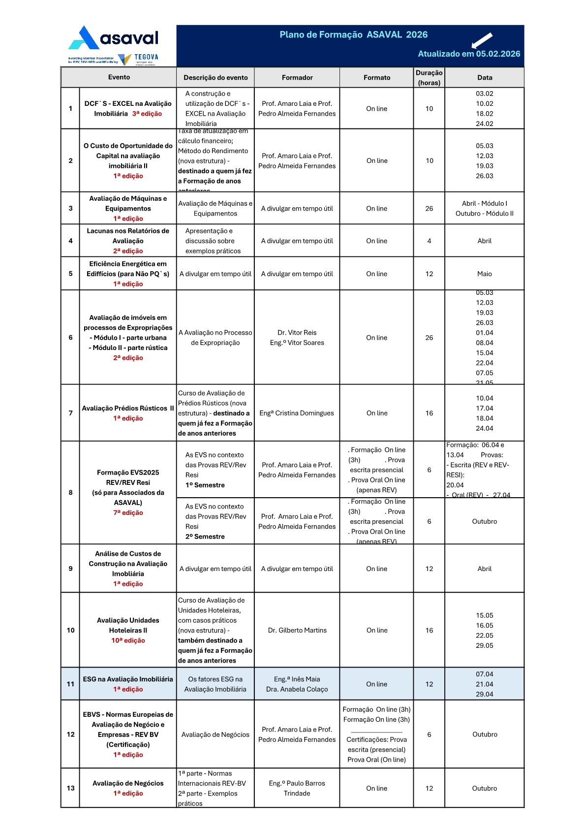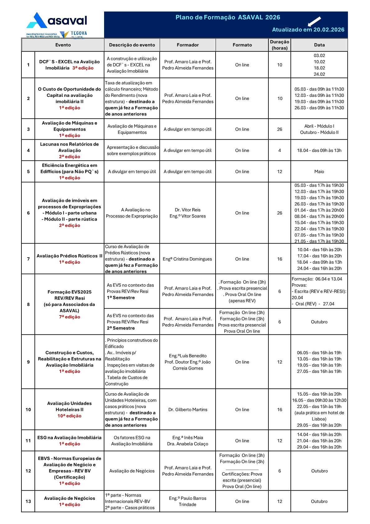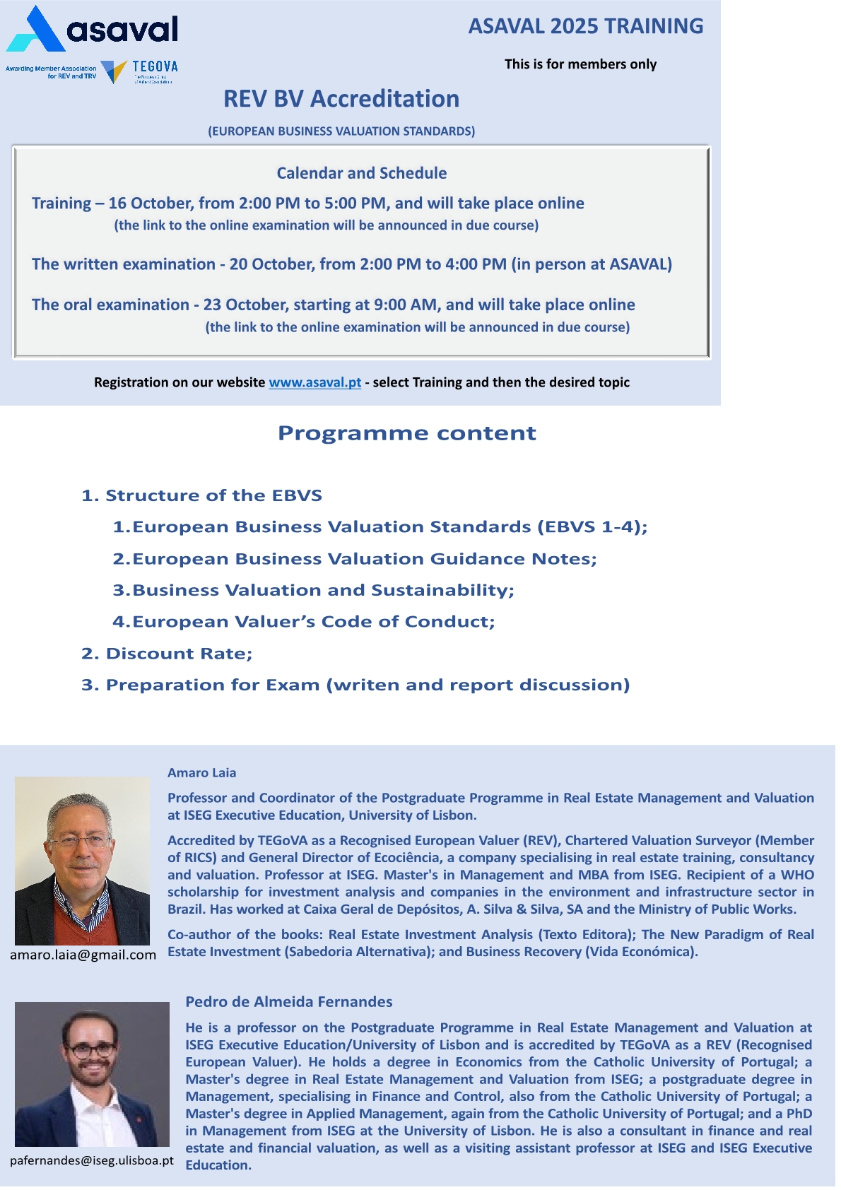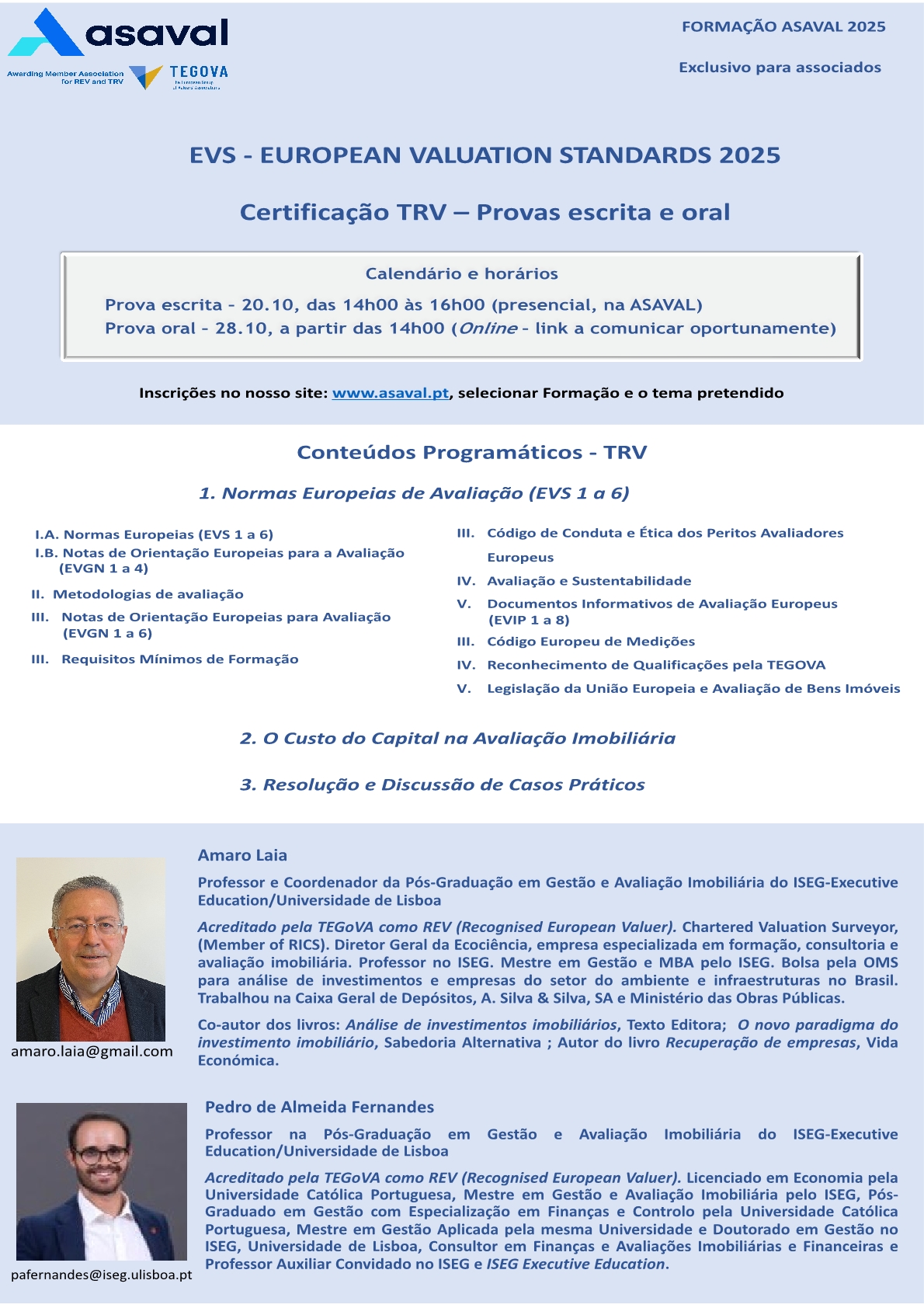 EVS 2020: Continua disponível e em exclusivo para os Associados da ASAVAL, ao preço simbólico de 25€, a versão Portuguesa das EVS 2020. Para os não Associados da ASAVAL e caso pretenda adquirir esta publicação, pelo preço de 125€, ou tornar-se nosso Associado, por favor enviar um email para: