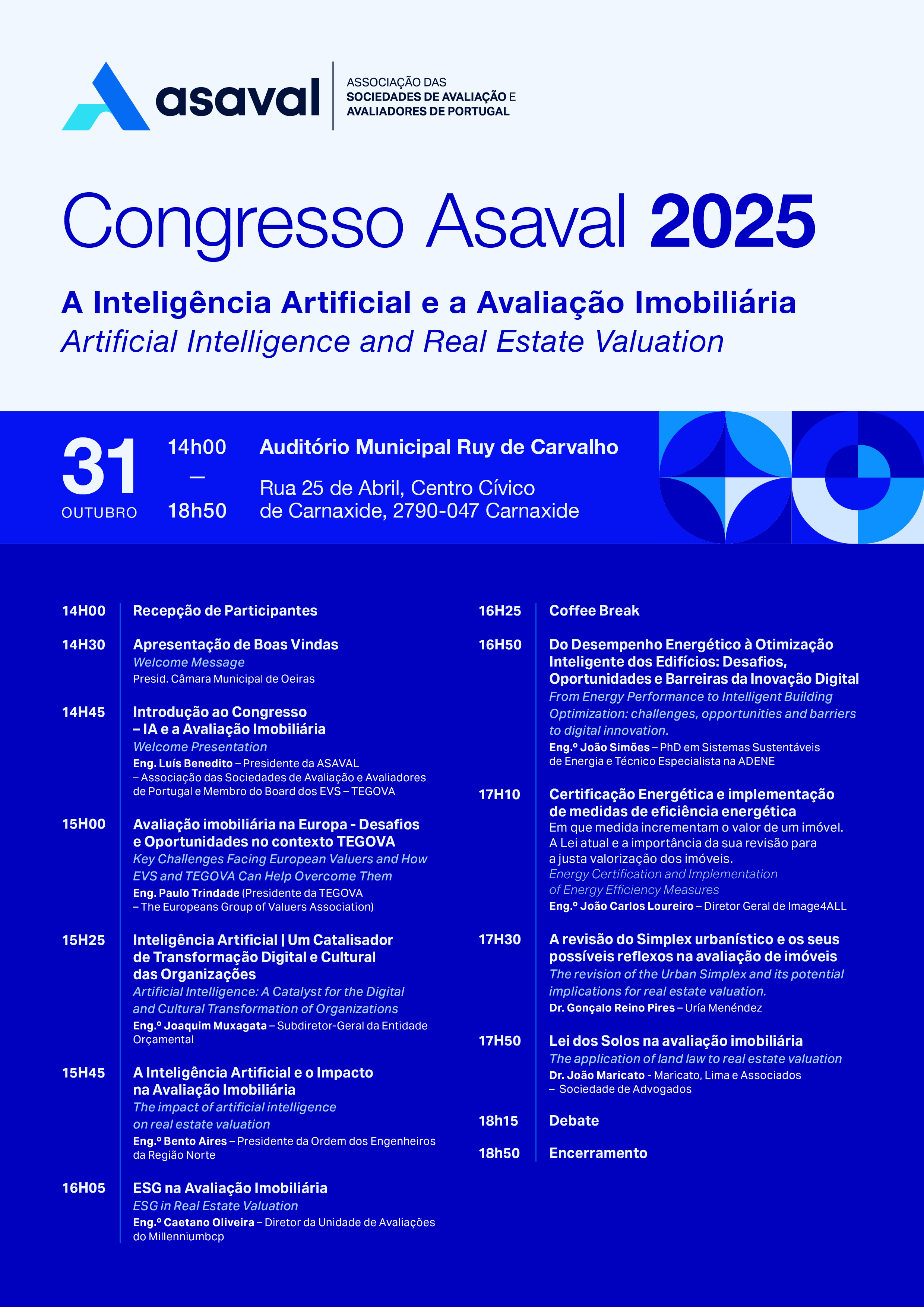Realizou-se no dia 31 de Outubro, o Congresso Anual da ASAVAL 2025, este ano dedicado ao Tema “A Inteligência Artificial e a Avaliação Imobiliária” com a participação de um painel riquíssimo de prestigiados oradores.