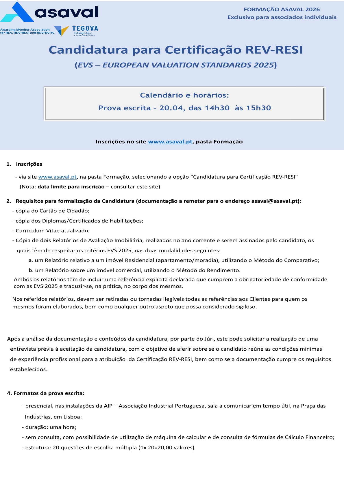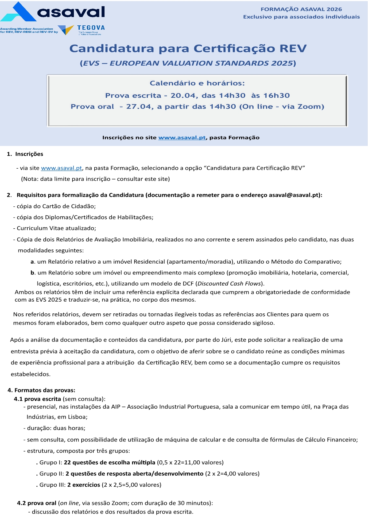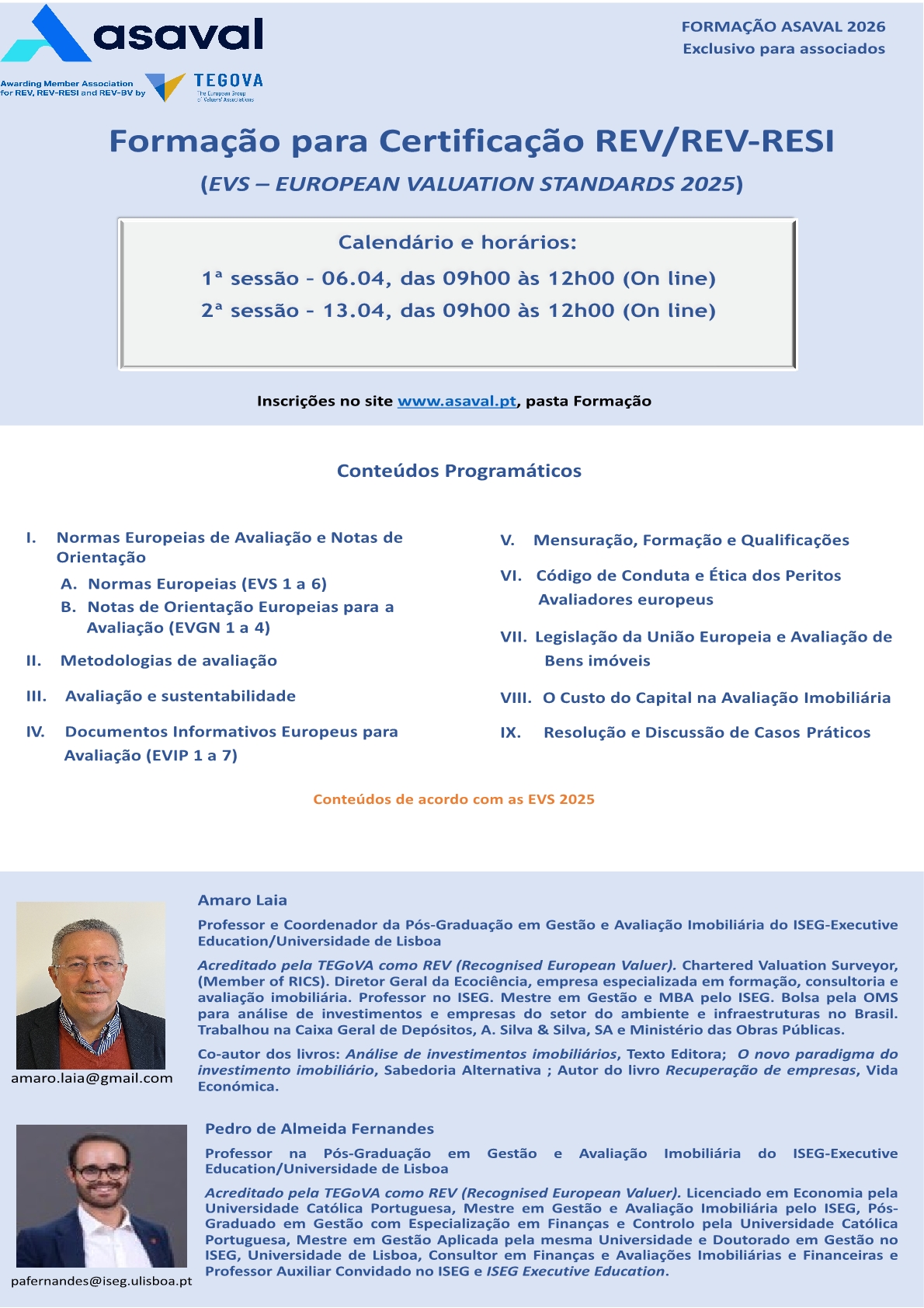 A ASAVAL valoriza a formação contínua dos peritos avaliadores, promovendo cursos periódicos sobre matérias específicas da avaliação e dispõe de protocolos internacionais, os quais permitem o acesso a um conjunto de plataformas de formação nos mais variados temas da atividade.