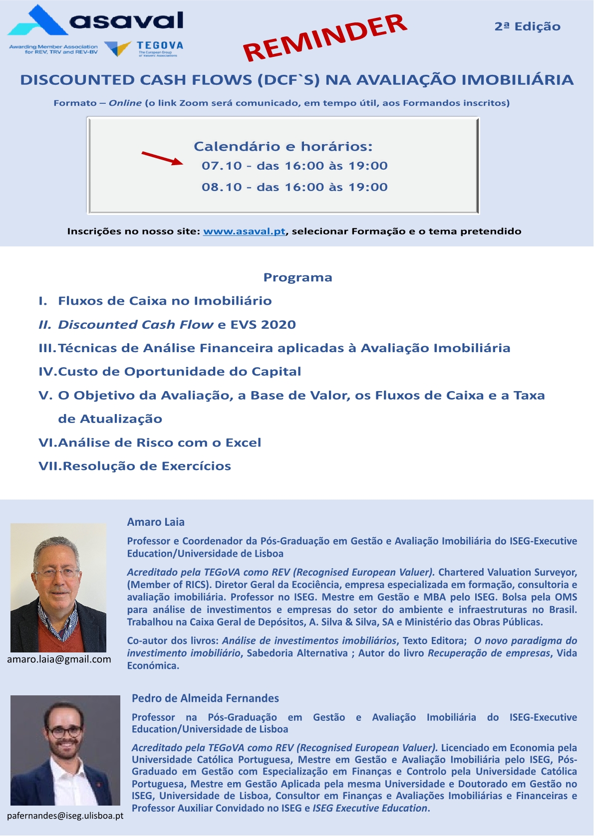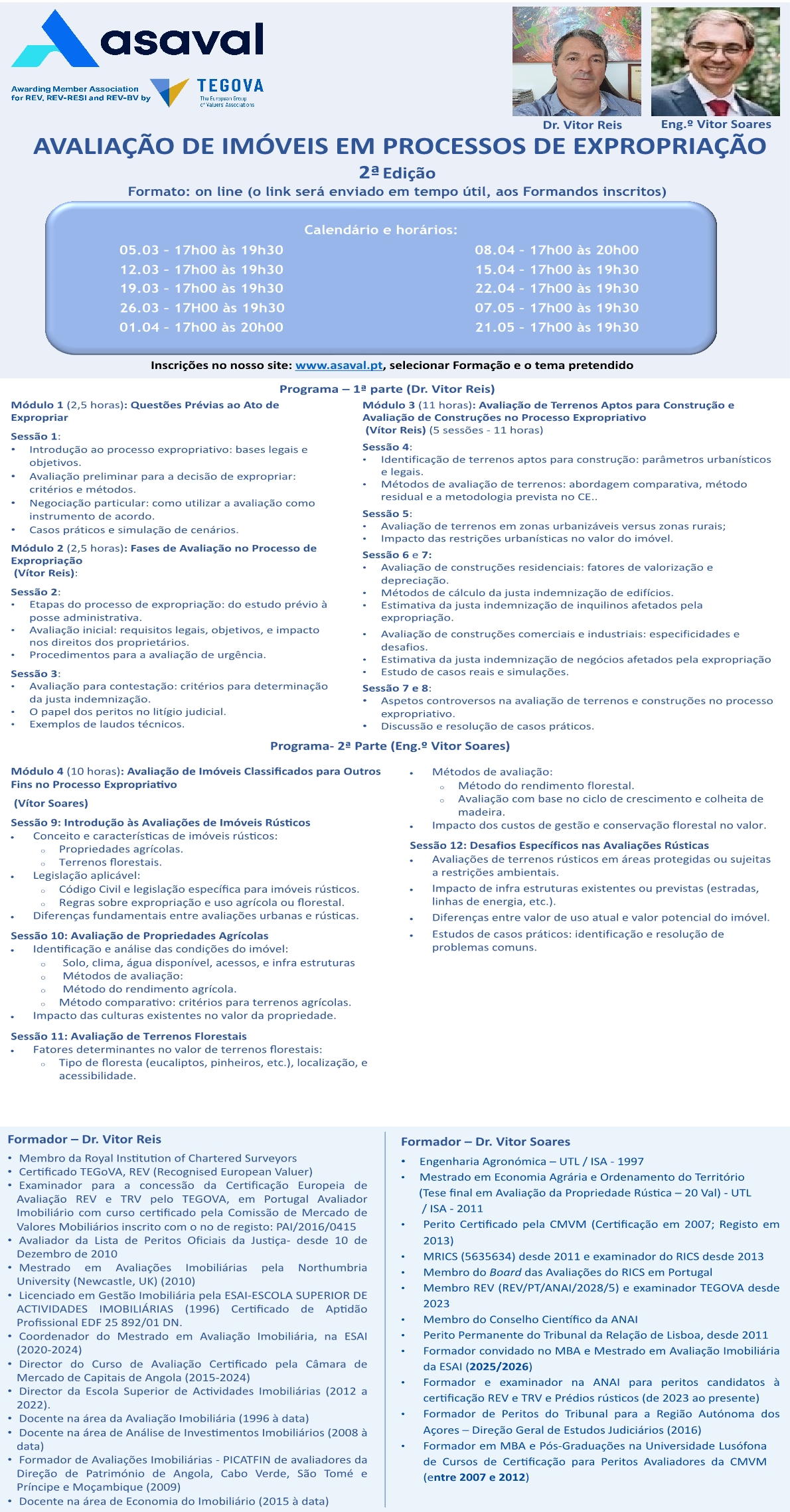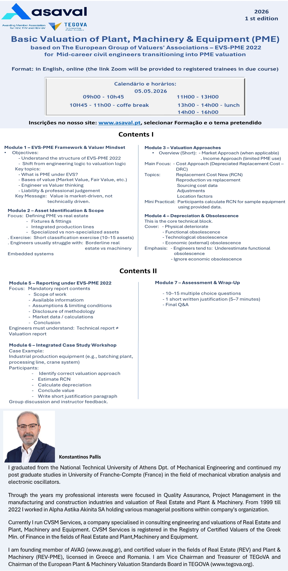 A ASAVAL valoriza a formação contínua dos peritos avaliadores, promovendo cursos periódicos sobre matérias específicas da avaliação e dispõe de protocolos internacionais, os quais permitem o acesso a um conjunto de plataformas de formação nos mais variados temas da atividade.