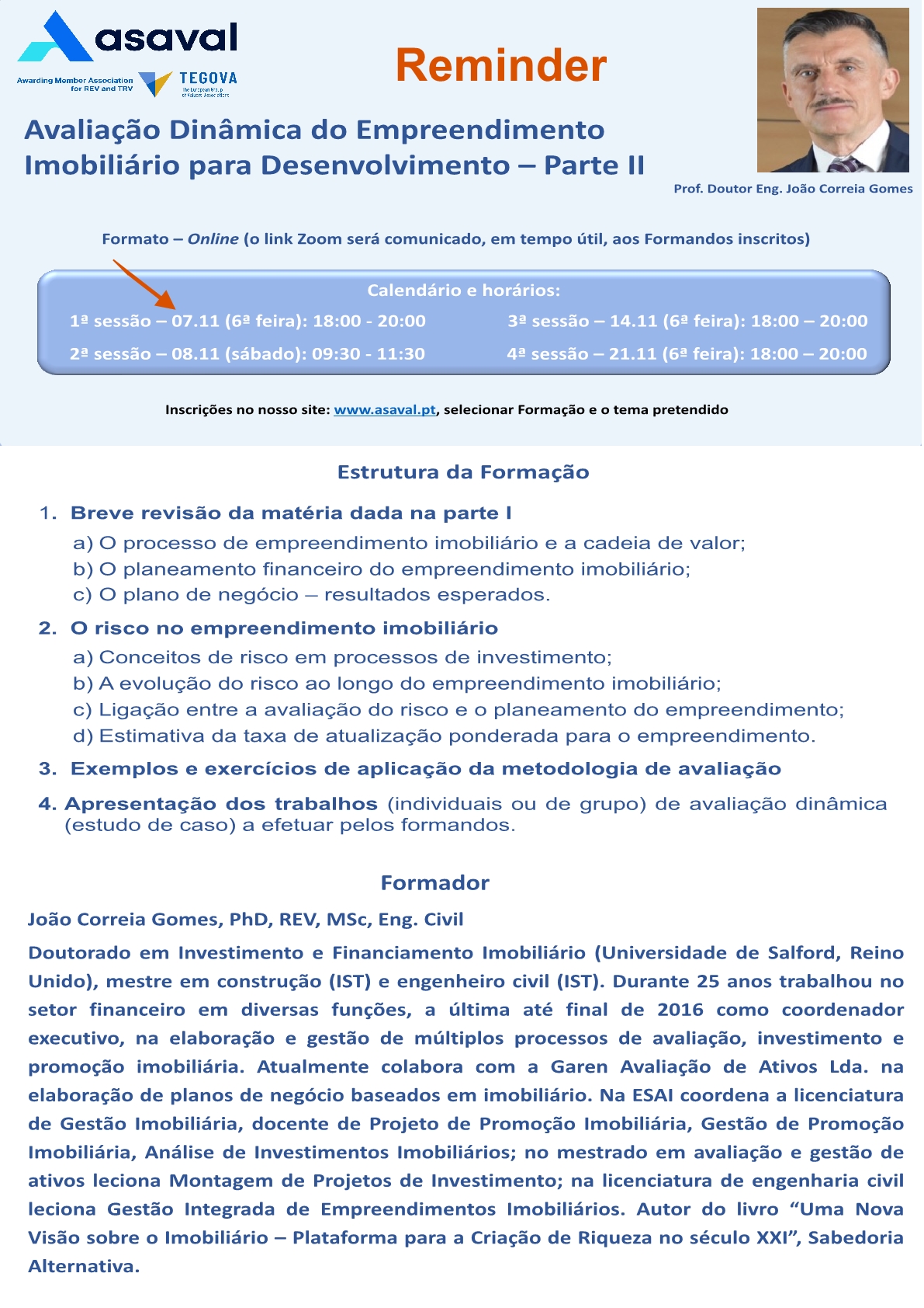 EVS 2020: Continua disponível e em exclusivo para os Associados da ASAVAL, ao preço simbólico de 25€, a versão Portuguesa das EVS 2020. Para os não Associados da ASAVAL e caso pretenda adquirir esta publicação, pelo preço de 125€, ou tornar-se nosso Associado, por favor enviar um email para: